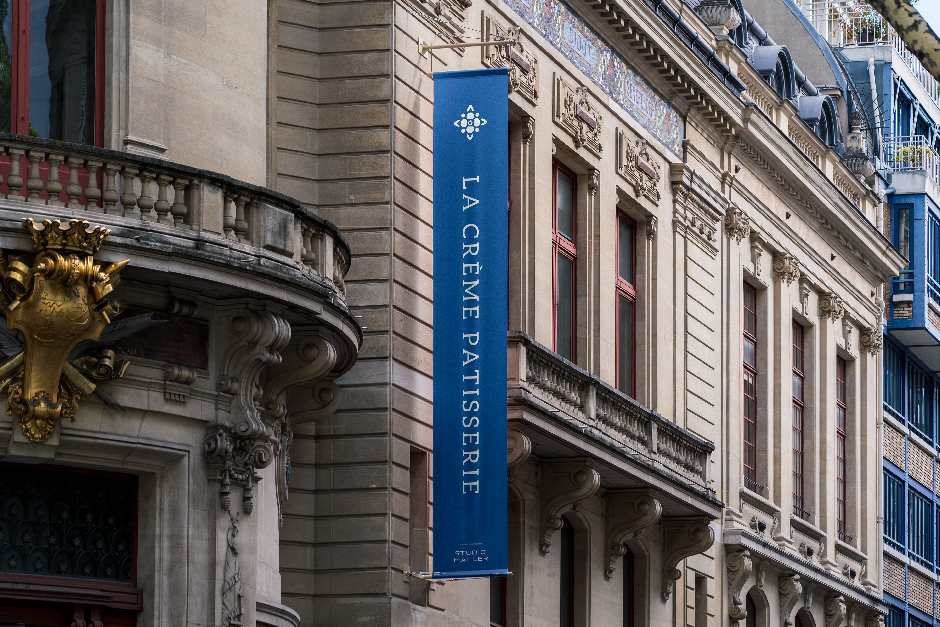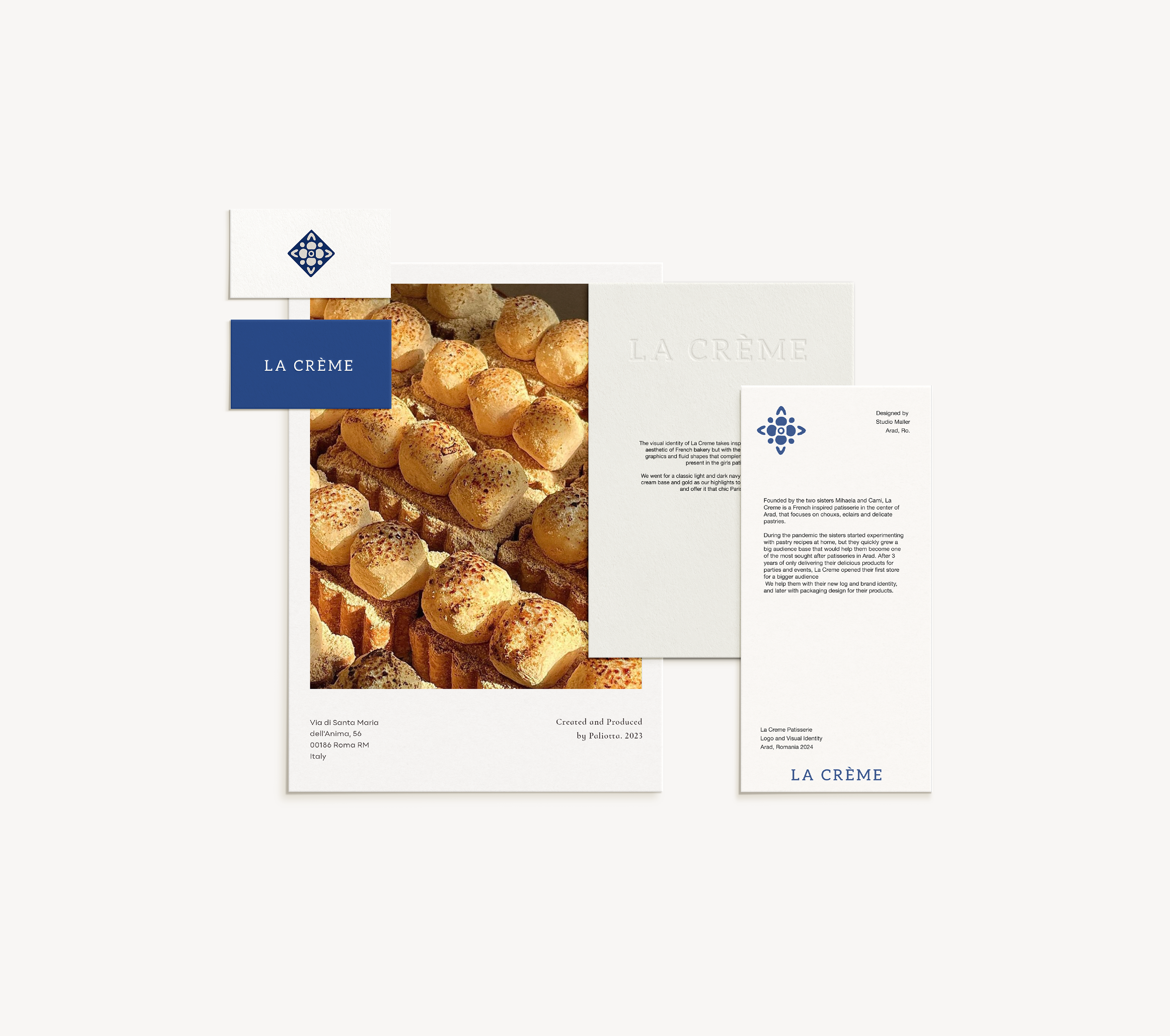 A further challenge was to create a brand identity that can both be simple, minimal and organic, but is also able transform into a chic and glamours brand that can evoke the Parisian spirit and reflect de delicate nature of La Cremes product. The dark blue tones is a strong and instantly recognisable base, but the gold accents combined with the carefully designed layouts position the patisserie as a premium brand.