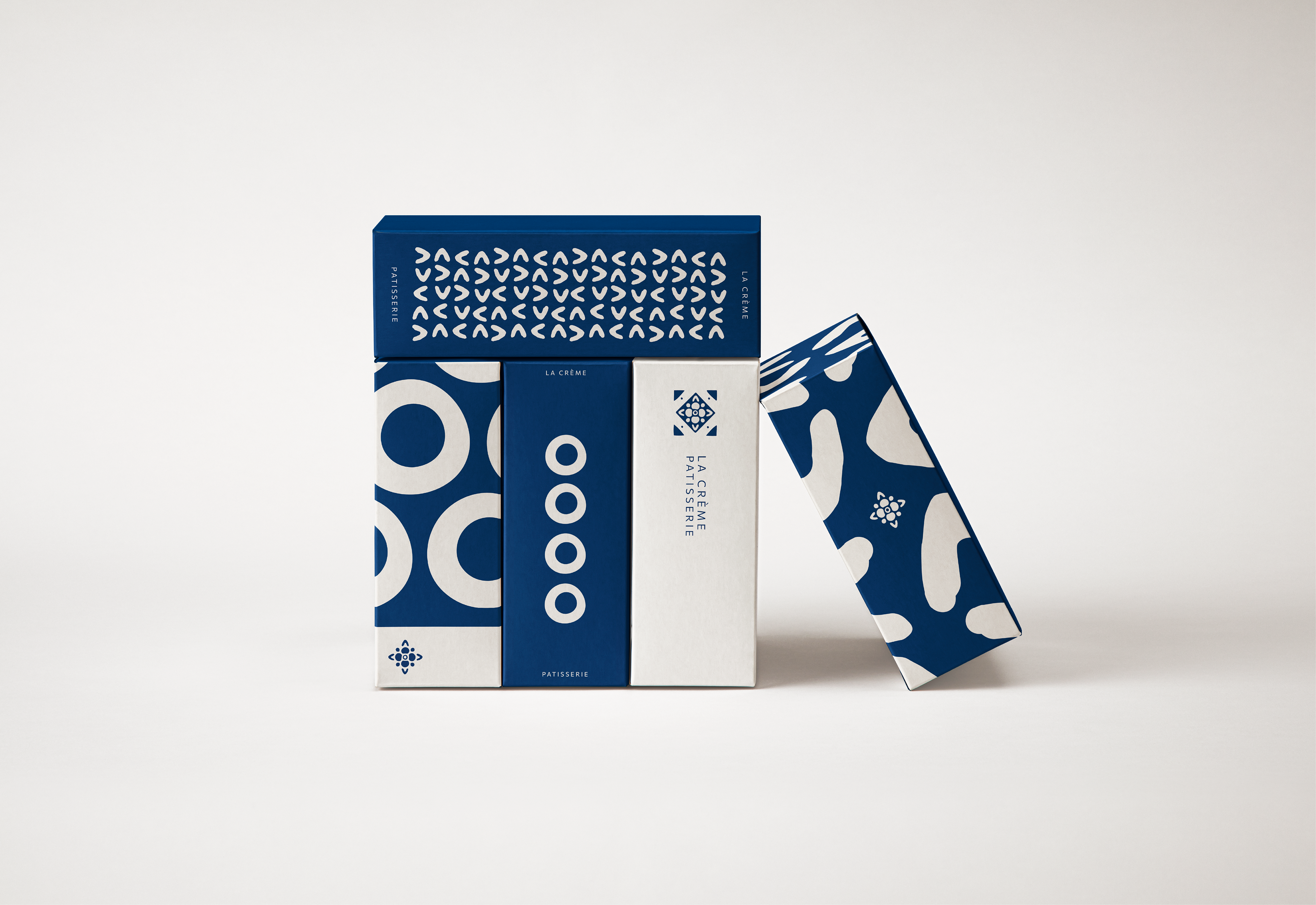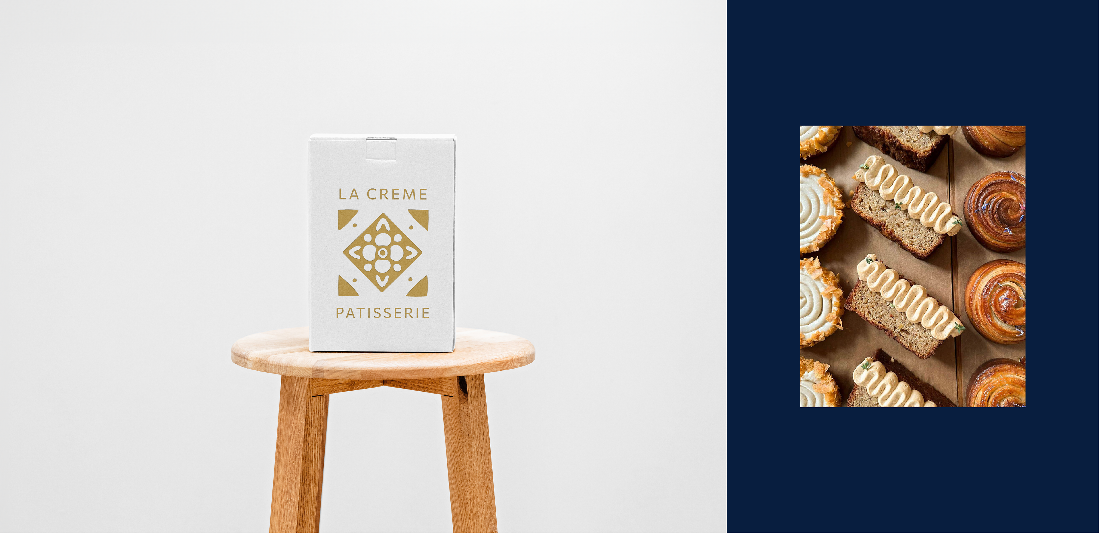La Creme's well crafted pastries are all created using delicately designed shapes to form beautiful composition. So it was clear that we had to integrate these into the final identity. Not only do the shapes form the log symbol, they also act as patterns for packaging, background and design assets.