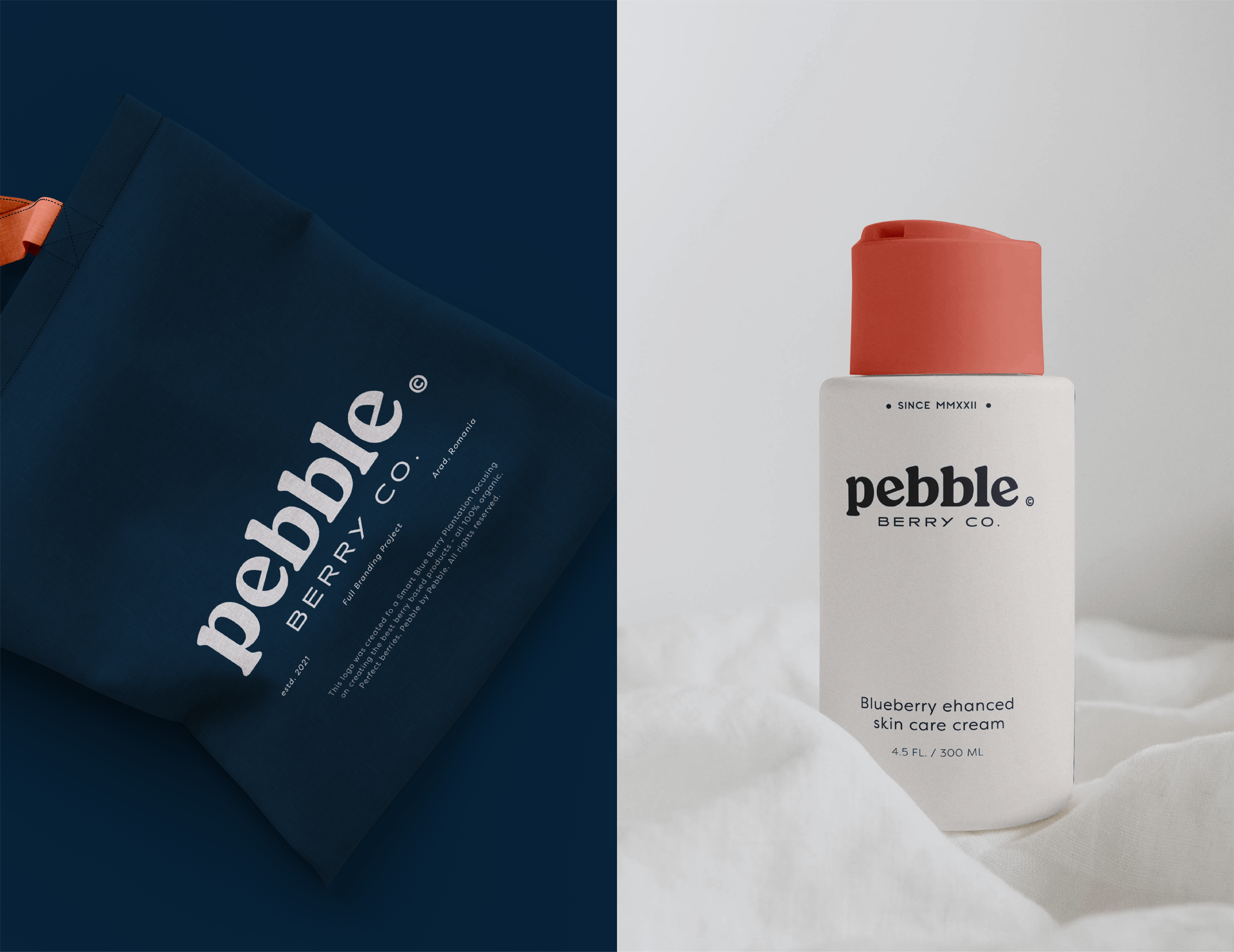 For this project we created a custom sans serif typeface with round bold letters but which are still elegant and timeless. Combined with a minimalistic and thin subtitle, the Pebble Berry Co.